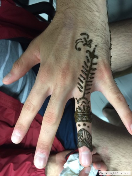 Henna is a plant that is processed and is made into a paste, which is drawn onto hands, feet, backs, and any body part normally seen. The paste dries and flakes off and the rich reddish brown artwork remains. The temporary henna tattoo lasts about a week if it isn’t scrubbed off.